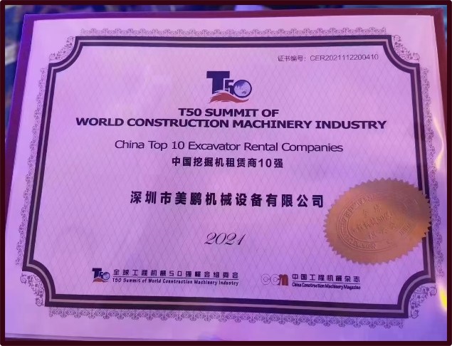 2021年榮獲“中國挖掘機(jī)租賃商10強(qiáng)”