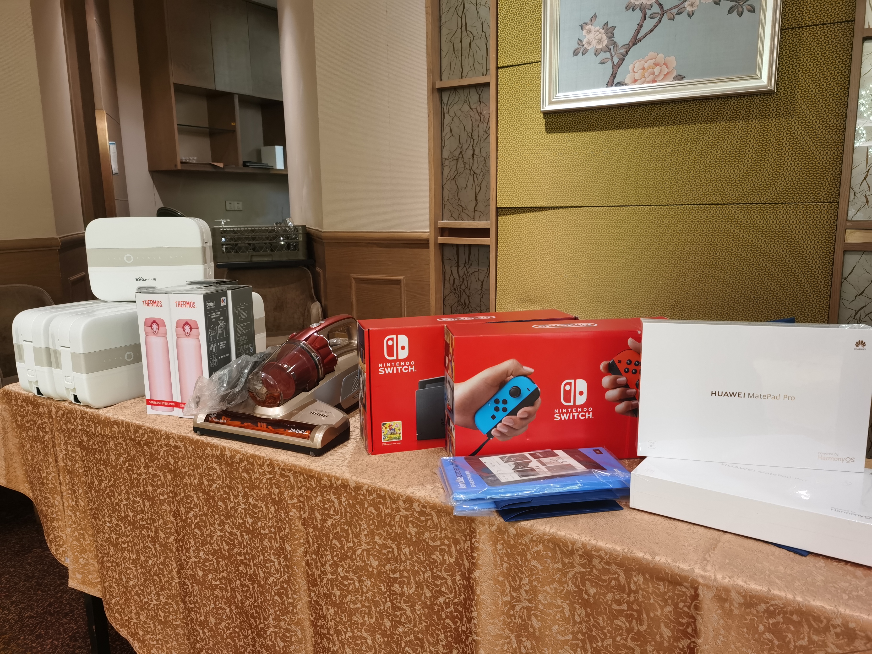 下午18點(diǎn)左右,全體參會(huì)人員移動(dòng)到餐廳一起用晚餐,公司為晚宴準(zhǔn)備了抽獎(jiǎng)活動(dòng),中獎(jiǎng)率竟高達(dá)百分之一百!現(xiàn)在讓我們一起來看看都有哪些幸運(yùn)同事抱得大獎(jiǎng)而歸吧~